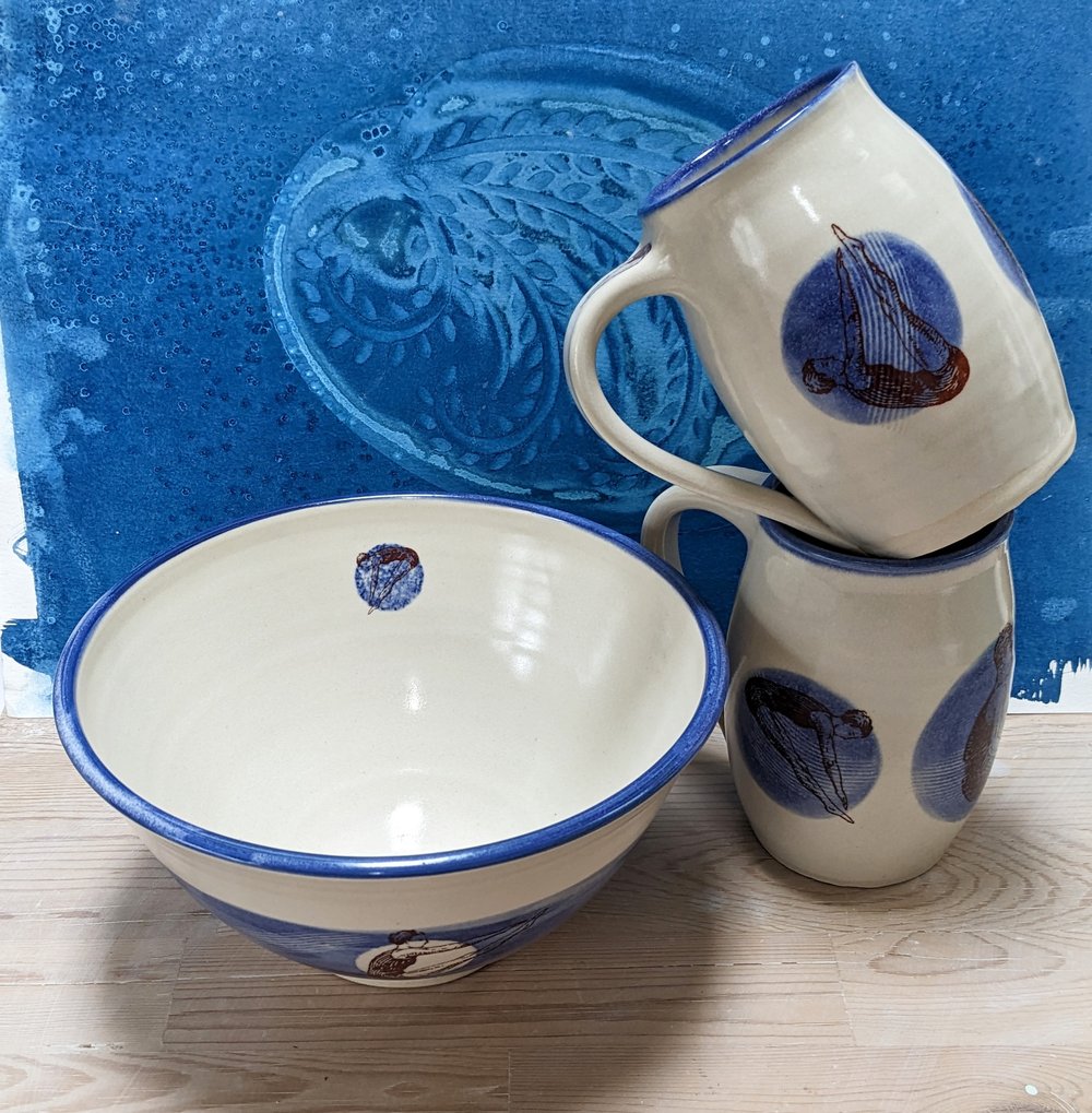 Celebrating those swimmers and/or divers the water babies in your life - maybe you are the water baby (I am!!). A lovely serving bowl and two generous mugs to celebrate diving into your day.