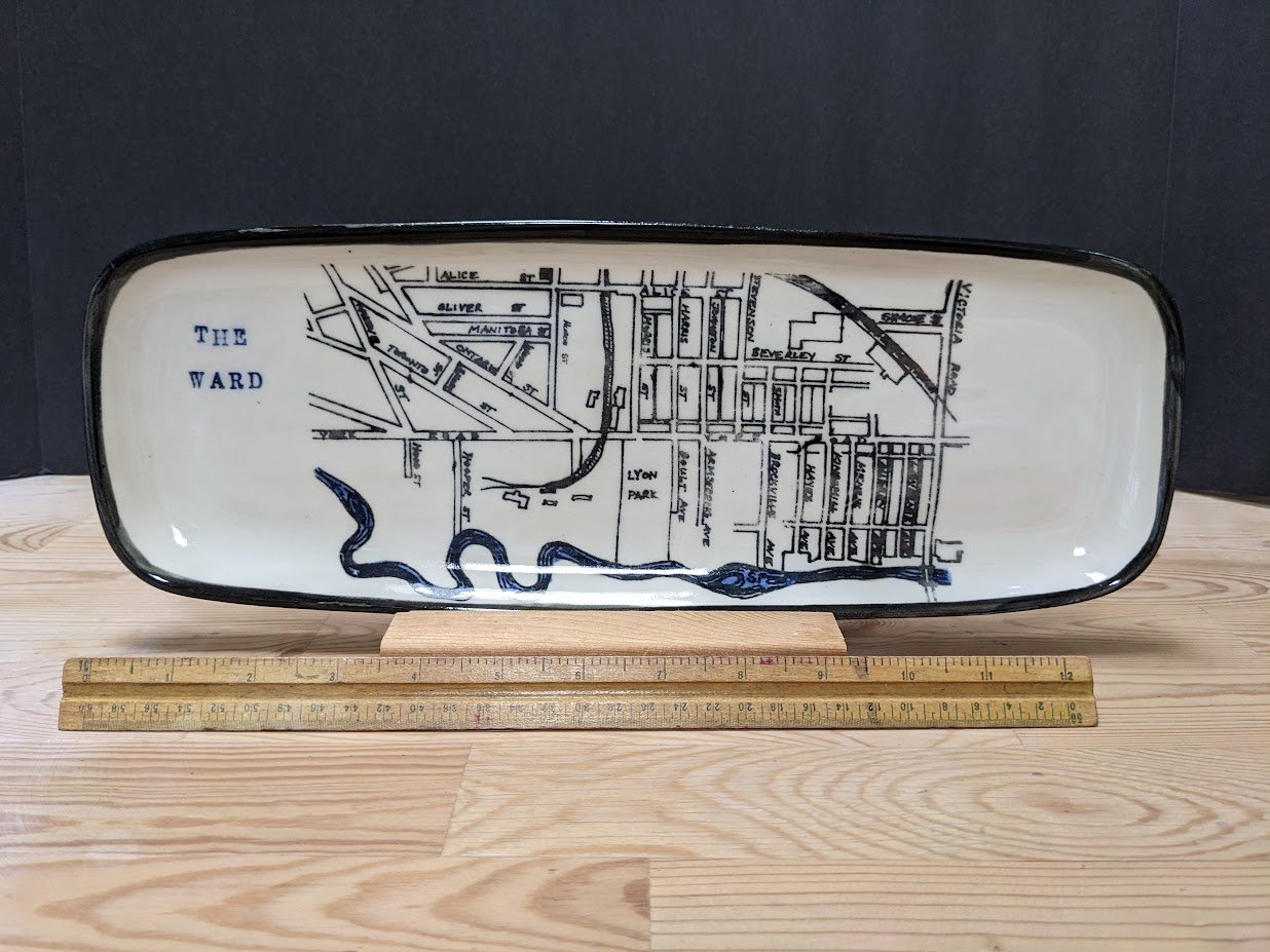 Okay fellow, former and/or fans of Guelph's famous neighbourhood, The Ward, here is your chance to own one of my 'famous' Ward inspired pieces of pottery. This serving platter makes a great house warming or wedding gift. This is the medium size and is available in black lettering in this size only. The map is from the 1930's and shows a Guelph from the time when many families were immigrating to the area.